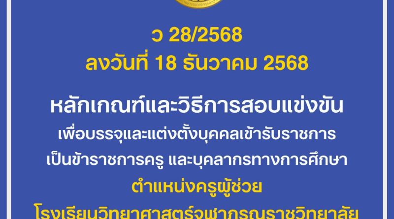 ว 28/2568 หลักเกณฑ์และวิธีการสอบแข่งขันเพื่อบรรจุและแต่งตั้งบุคคลเข้ารับราชการเป็นข้าราชการครู และบุคลากรทางการศึกษา ตำแหน่งครูผู้ช่วย โรงเรียนวิทยาศาสตร์จุฬาภรณราชวิทยาลัย สังกัดสำนักงานคณะกรรมการการศึกษาขั้นพื้นฐาน