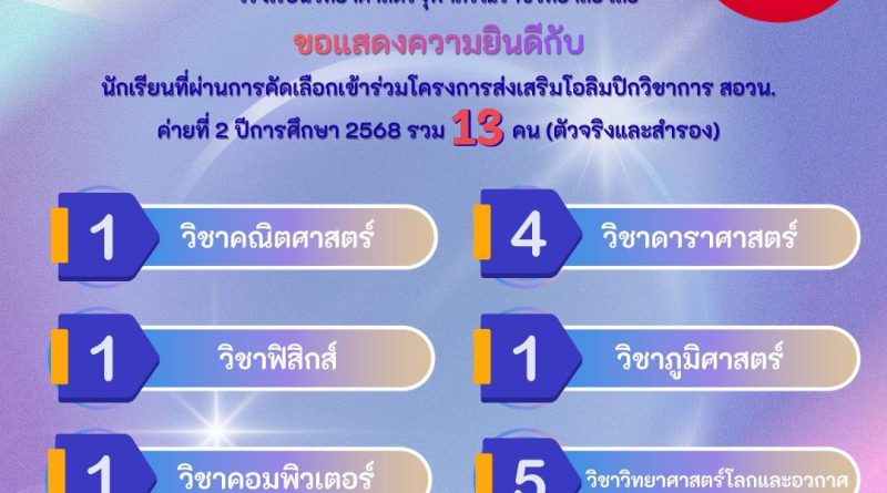 กิจกรรมการจัดการเรียนการสอน 18 ธันวาคม 2025 ADMIN PCSHSLOEI นักเรียนที่ผ่านการคัดเลือกเข้าค่ายโอลิมปิกวิชาการ สอวน. ค่ายที่ 2 ประจำปีการศึกษา 2568 สรุปจำนวนนักเรียนที่ Read More